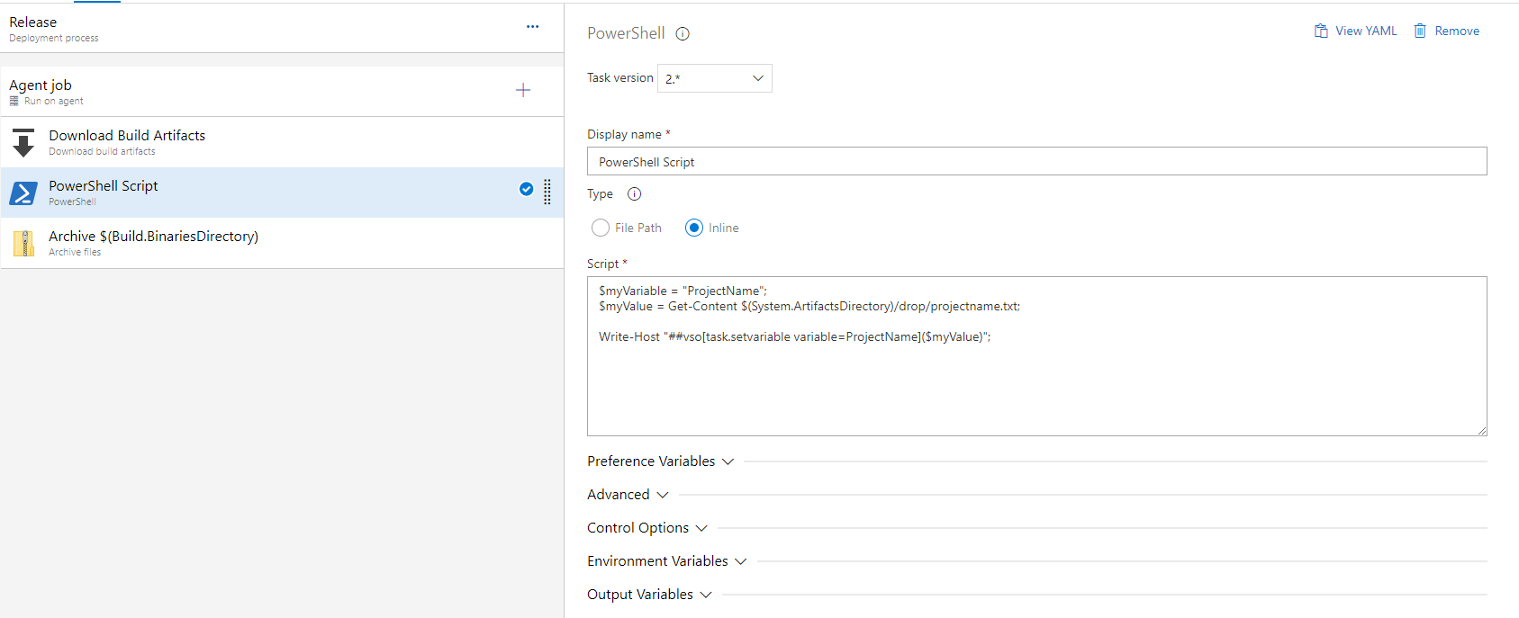 $myVariable = "ProjectName"; $myValue = Get-Content $(System.ArtifactsDirectory)/drop/projectname.txt; Write-Host "##vso[task.setvariable variable=ProjectName]($myValue)";