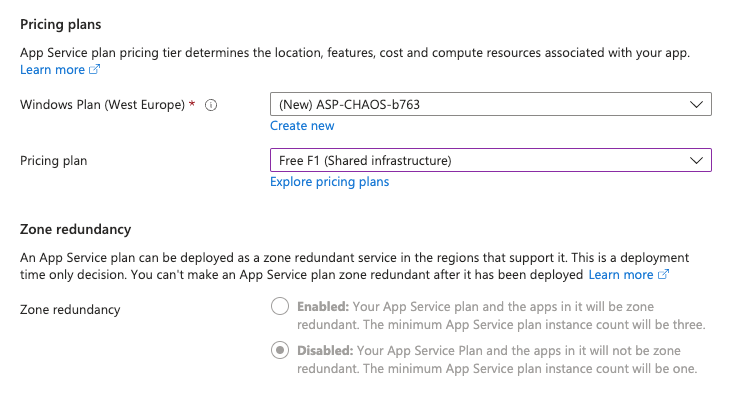 In this series of articles we will describe how we can implement our chaos engineering framework using Azure services. In order to put chaos into test we will first create an app service (web app) that we will try to test through chaos experiments. During the creation of the web app we should select the Free tier in order to have Zone redundancy disabled. This means that our application will not have high availability across different zones.