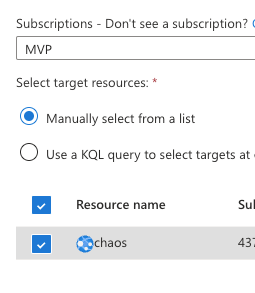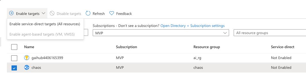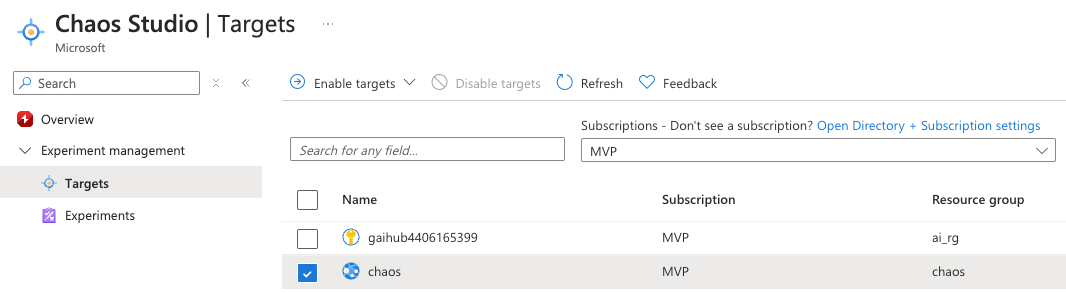 And then we should select the target. Before adding our target inside the experiment we should go under targets in chaos studio and enable our target by pressing the button.